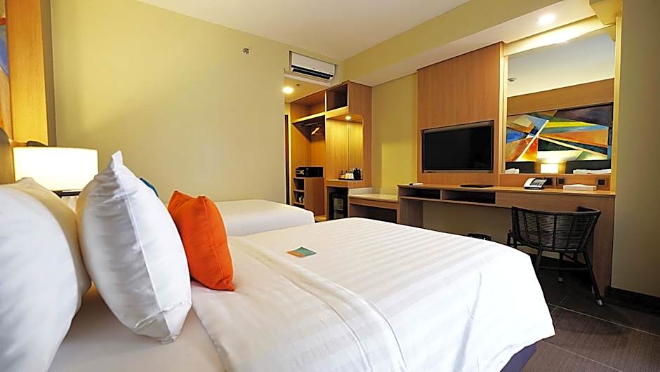 The spacious twin/double room provides air conditioning, a mini-bar, a terrace with pool views as well as a private bathroom featuring a bath.